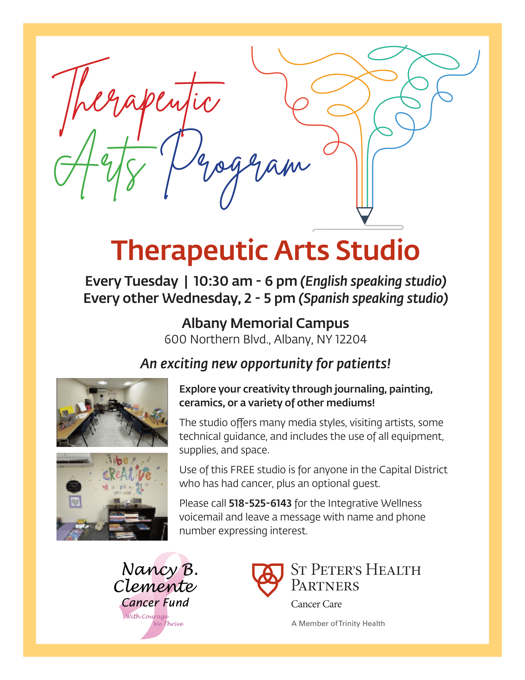The St. Peter’s Health Partners Cancer Care Therapeutic Arts Studio is free to all Thrivers/Survivors of the Capital Region.