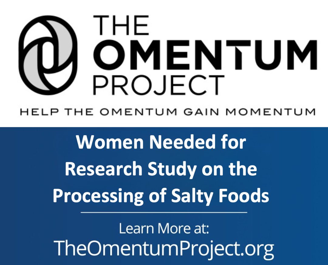 The Omentum Project is still actively seeking participants to help improve the understanding of life without an omentum for cancer survivors. This ongoing study is focused on how women with and without an omentum respond to consuming salty foods. If you meet the criteria, you can participate in a simple, one-time, three-hour home experiment. Your contribution is essential to this important research. Sign up today by taking the online eligibility survey and help us continue making a difference!